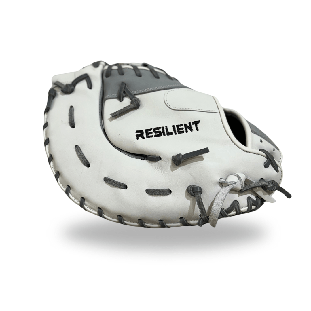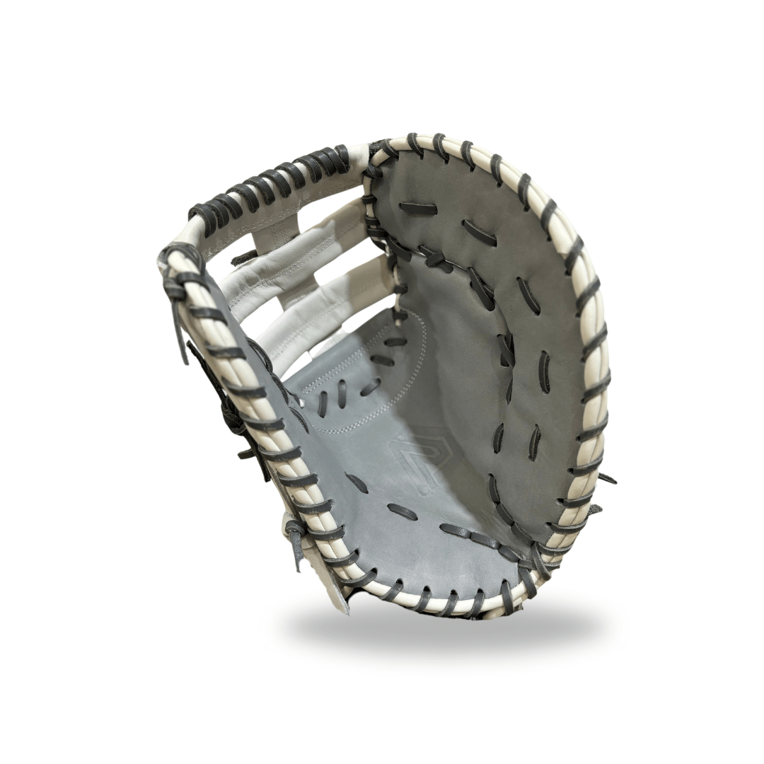 This 1st Base Mitt is part of the Heirloom Series. The outer shell is dressed in white, with gray lace and palm. Constructed of Rosie's Superior Kip Leather, it is the preferred choice of college and professional players due to its lightweight feel and extreme durability. This glove features a single post with a double bar web and an open back. This high-performance glove will allow you to welcome any batter to Bring the Smoke!